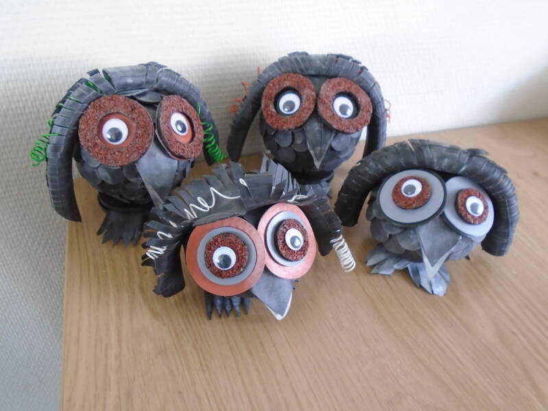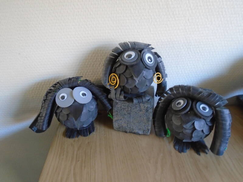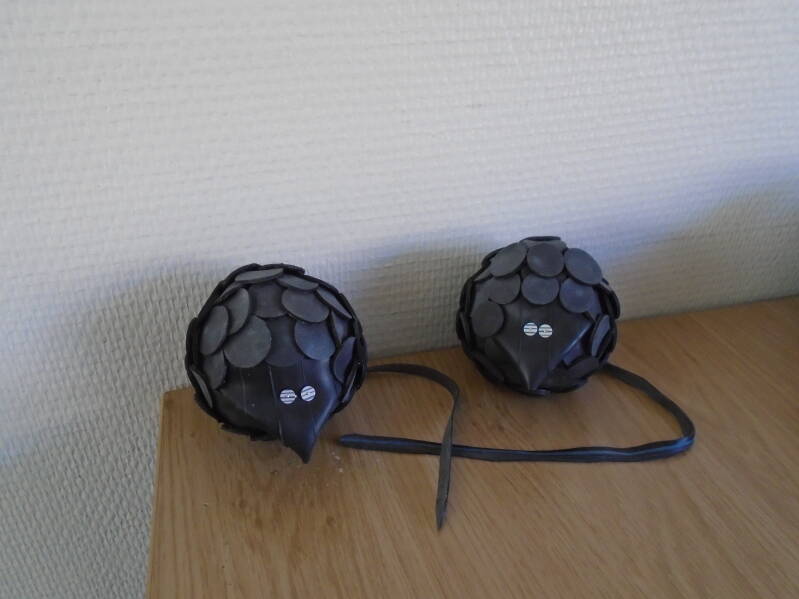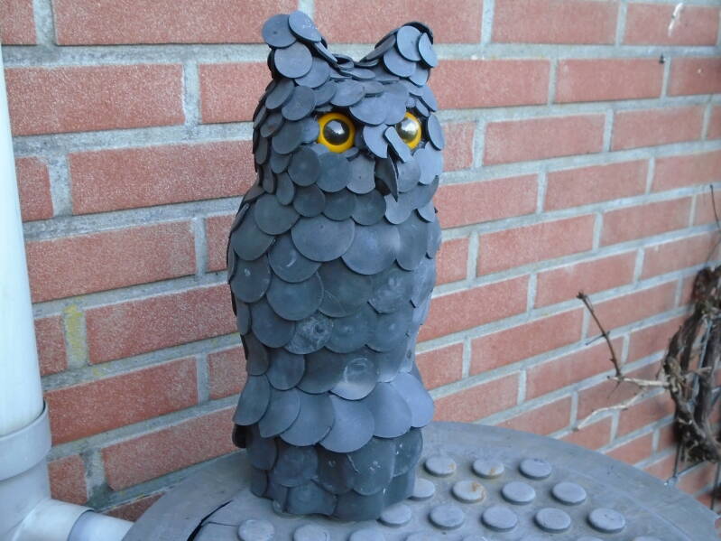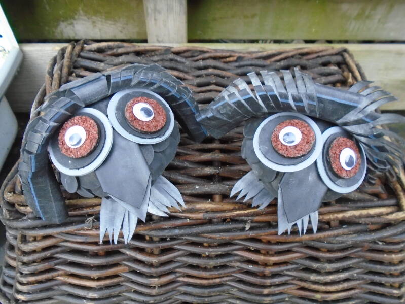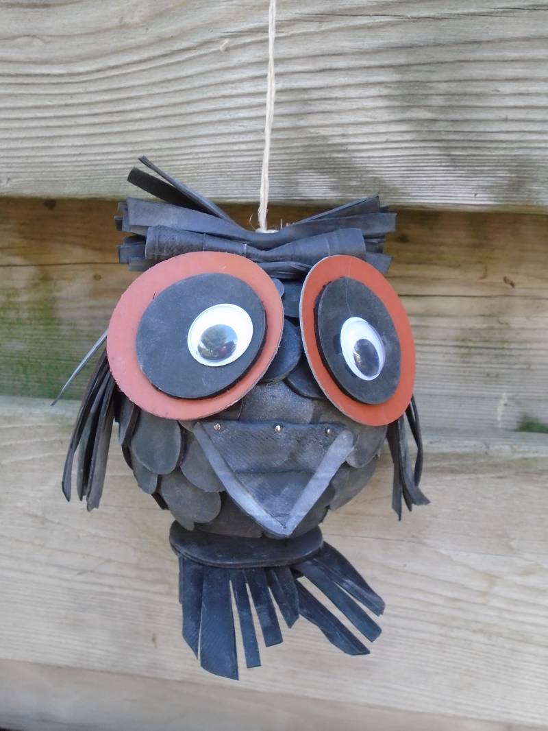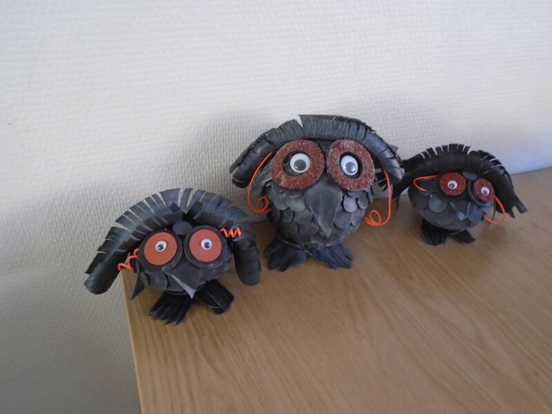 februari 2015 : de laatste gemaakte uiltjes, deze keer een combinatie van fietsbanden en dakleer.