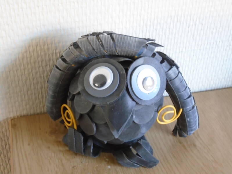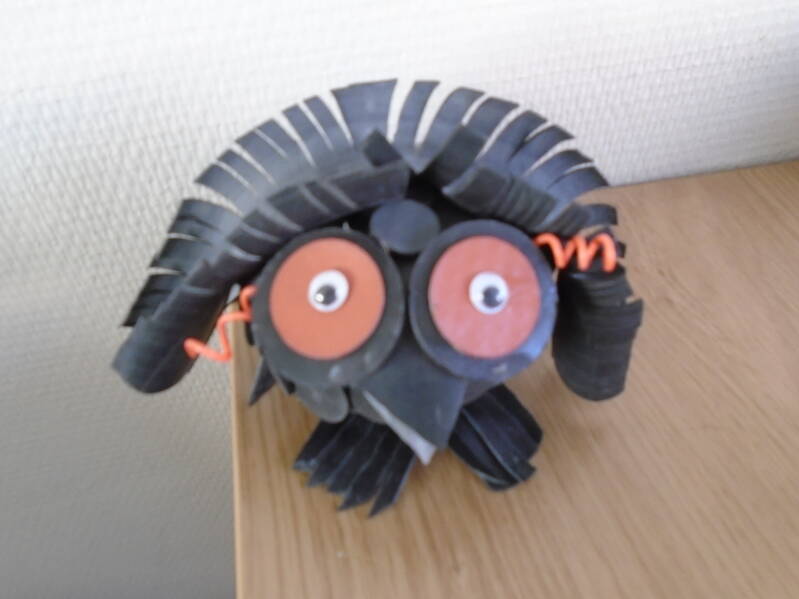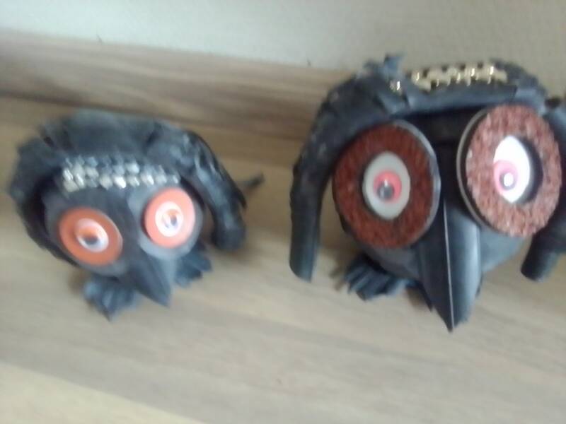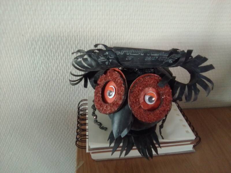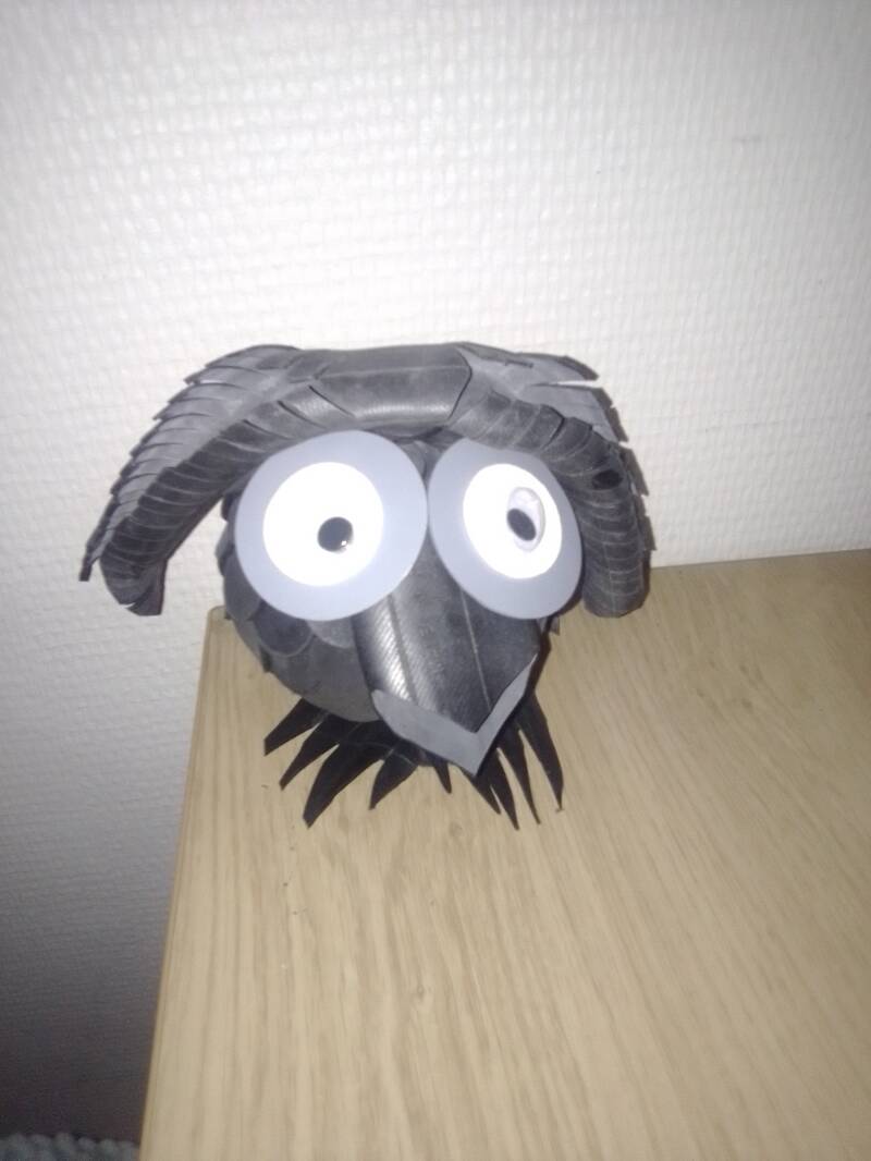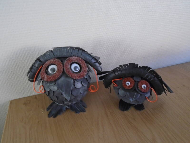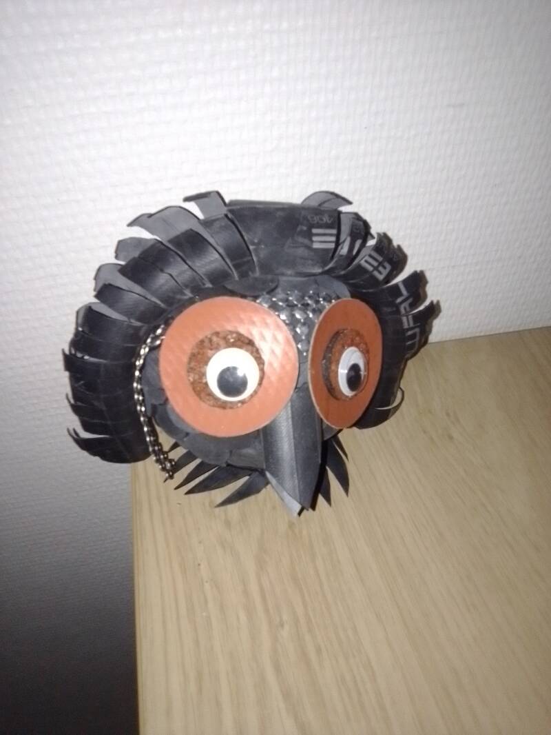 februari 2015 : de laatste gemaakte uiltjes, deze keer een combinatie van fietsbanden en dakleer.