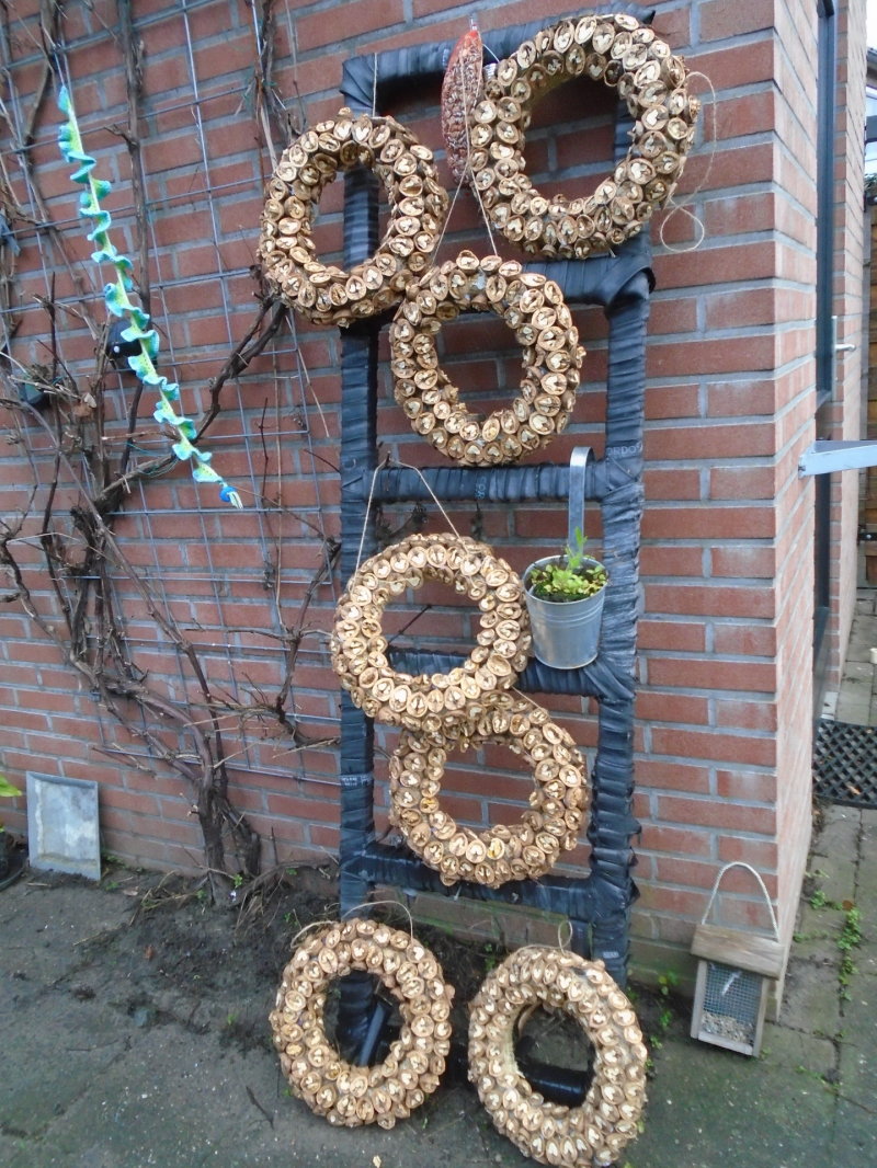 mijn welkomkrans aan de voordeur, gemaakt van oude krans met dubbele fietsbanden juli 2015.