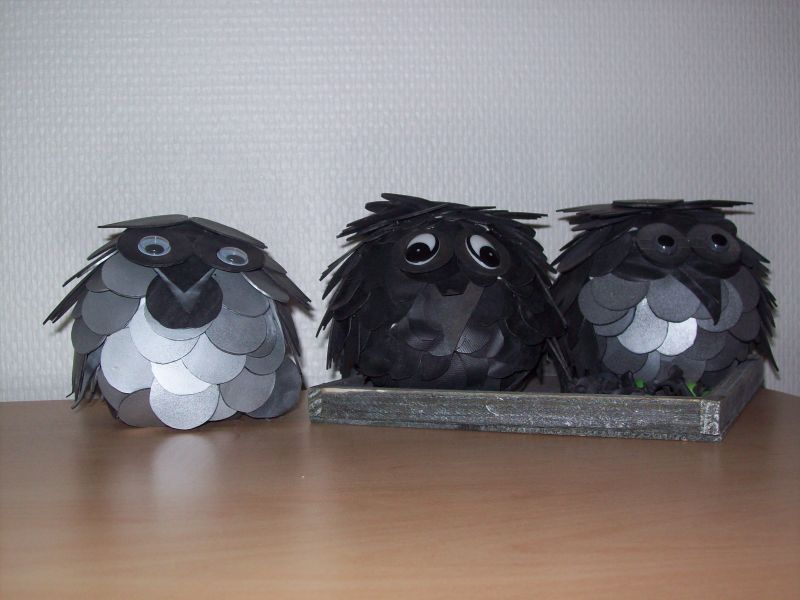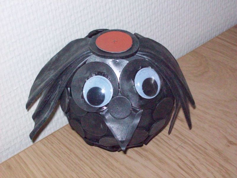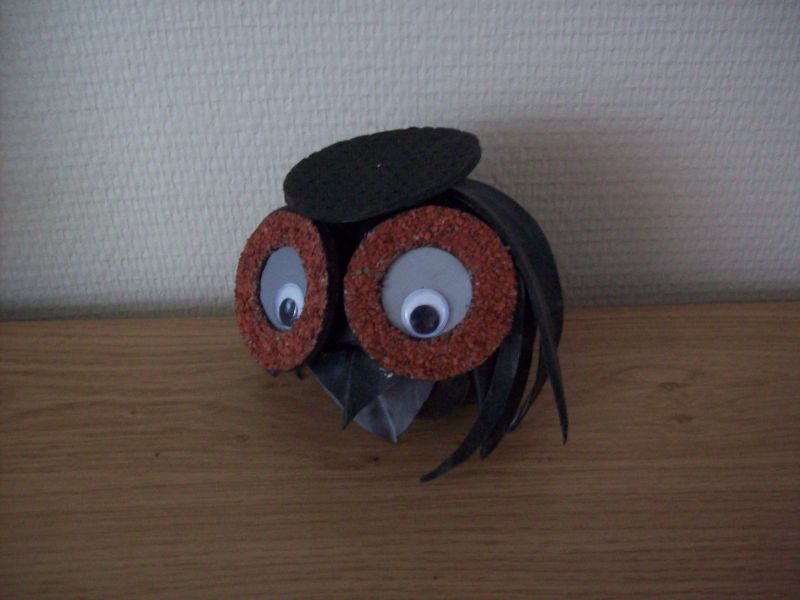 uiltje plat model gemaakt van grijze rondjes, dakleer met vleugels van fietsband. nov 2015
